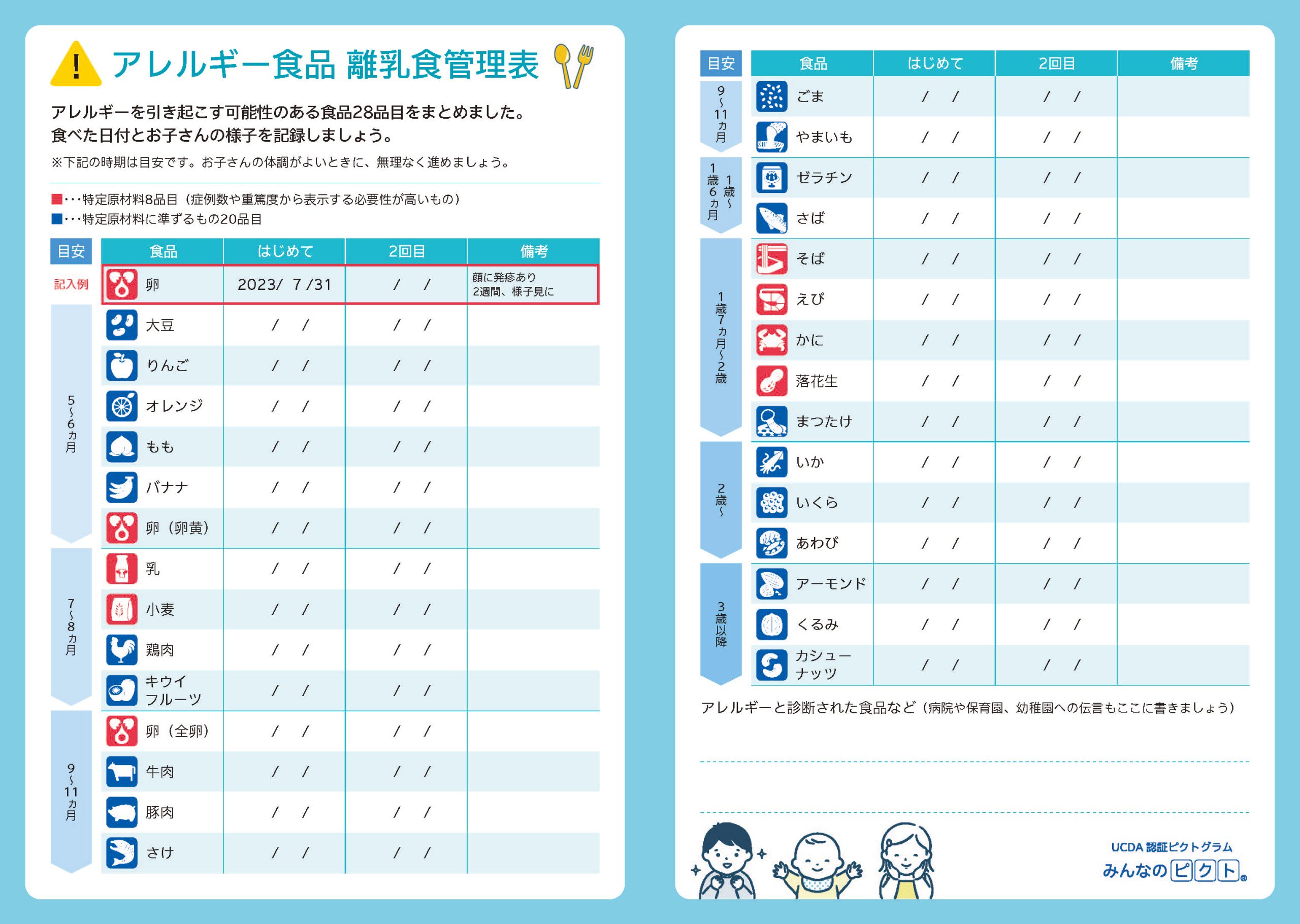 「アレルギー食品 離乳食管理表」とは、母子手帳に掲載することを想定して制作したもので、離乳食期の子どもの食物アレルギーの記録を書き込める離乳食管理表です。アレルギーを起こす可能性のある食品28品目をピクトで掲載、なかでも重篤度の高い8品目は赤で掲載し、摂食時の注意を促すこととしました。自身に食物アレルギーがない親の場合、食物アレルギーの知識に乏しく、気づきや発見が遅くなりがちです。妊婦なら必ず目を通す母子手帳を通じて食物アレルギーへの気づきを早期に促せること、また一覧性が高いことにより医療機関や保育機関との情報共有がしやすいこと、などが評価されての受賞となりました。