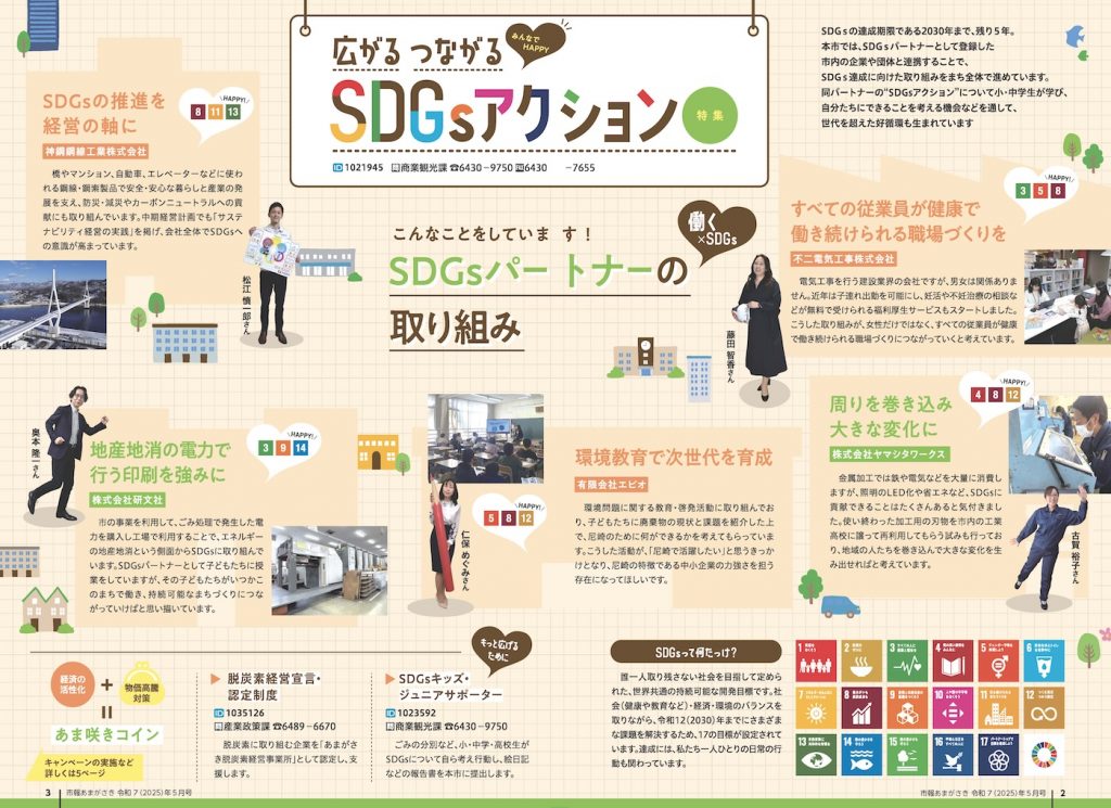 尼崎市の広報誌「市報あまがさき」令和7年(2025年)5月号の特集ページ「広がる つながる SDGsアクション」に当社の取組みが紹介されました。
