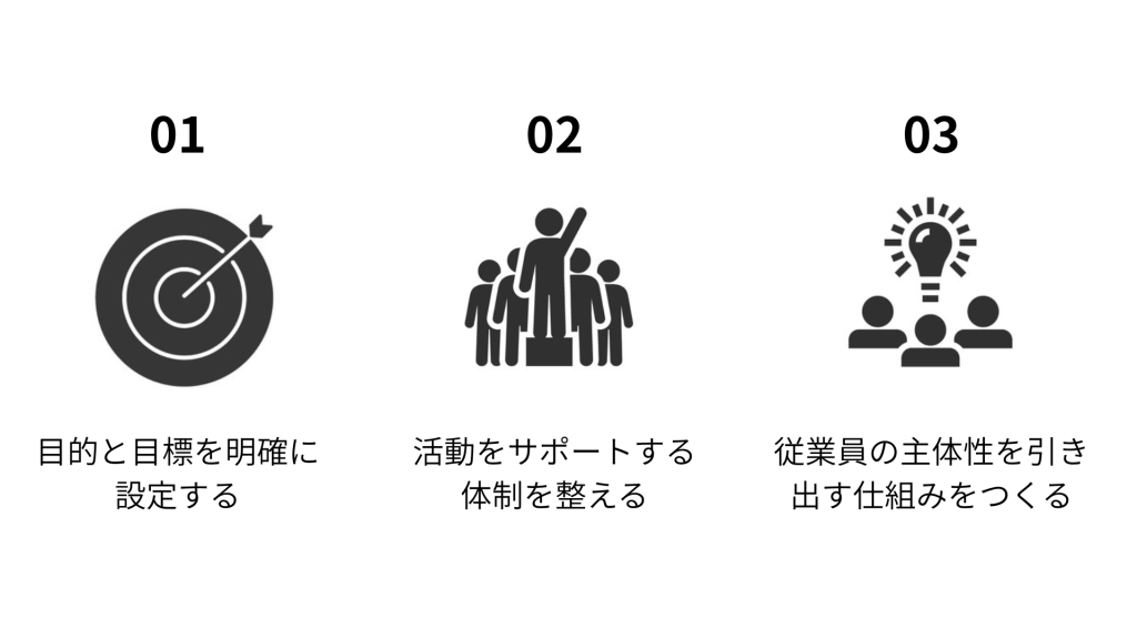 研文社における取り組みをはじめ、実践においては目的と目標の明確化、サポート体制の構築、従業員の主体性を引き出す仕組みづくりが成功の鍵となります。
